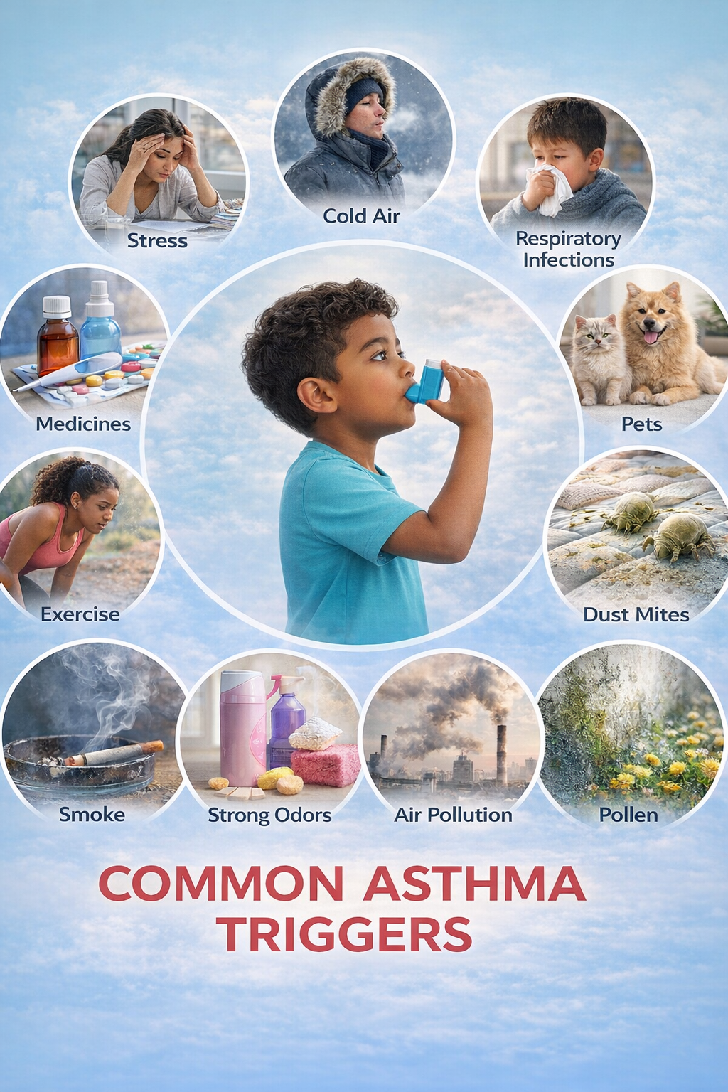 - Triggers such as allergies, exercise, respiratory infections, cold air, or irritants